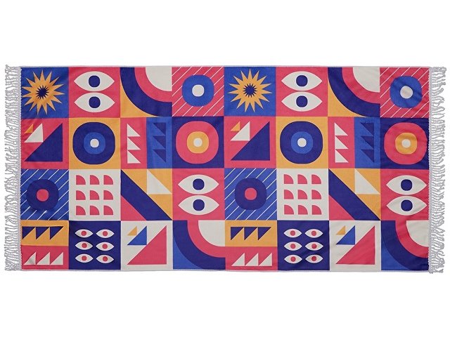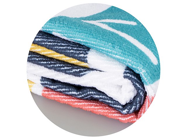 Необычный и трендовый вариант классического пляжного аксессуара. Круглая форма полотенца помогает быстро и удобно расстилать его на земле или шезлонге. Плотный полиэстер сохнет быстрее обычных тканей, поэтому полотенцу не требуется дополнительная упаковка после использования - достаточно ненадолго развесить его для просушки. Полноцветная печать на полотенце производится с помощью сублимации. Бахрома по краю может быть изготовлена в двух цветах (белый и чёрный) на выбор клиента.